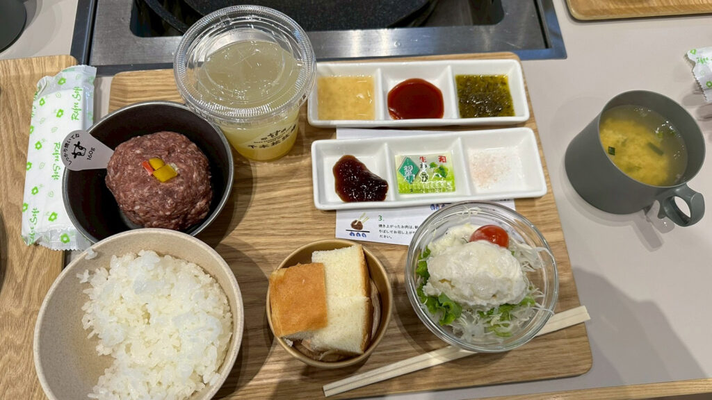 今回は、夕食と朝食をホテルで予約しました。夕食はステーキもオプションで頼みました。ソースは洋風か和風でしたが、塩と醤油が美味しかったかもでした。夕食を食べ、温泉に入り、RVパークに戻り、キャンピングカーの中でちょっと一杯やって、早めに寝ました。お姉さん夫婦は、リビング上部のベットで寝てもらいました。翌朝は少し早めに起きて温泉に浸かり、朝食を食べて、一服して出発しました。2日目は以前に行った、『プチゴルフガーデン🔗』で18ホールプレイして帰りました。