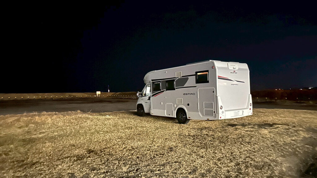 今回は、食事終わって車に戻り、いつもなら22時くらいに寝てましたが、今回はちょっと元気で、23:30くらいまで、つまみで一杯飲みました。