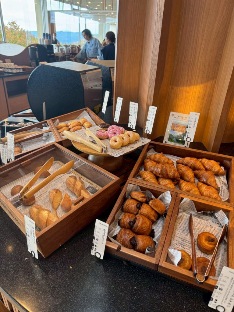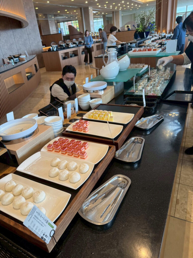 朝は私は早朝から男性と女性が入れ替わった温泉に入り、その後部屋で孫の世話をして、8時からの朝食を食べに行きました。朝食は1Fのラウンジでの『バイキング🔗』でした。ライブキッチンもあり、品数も豊富で沢山食べました。