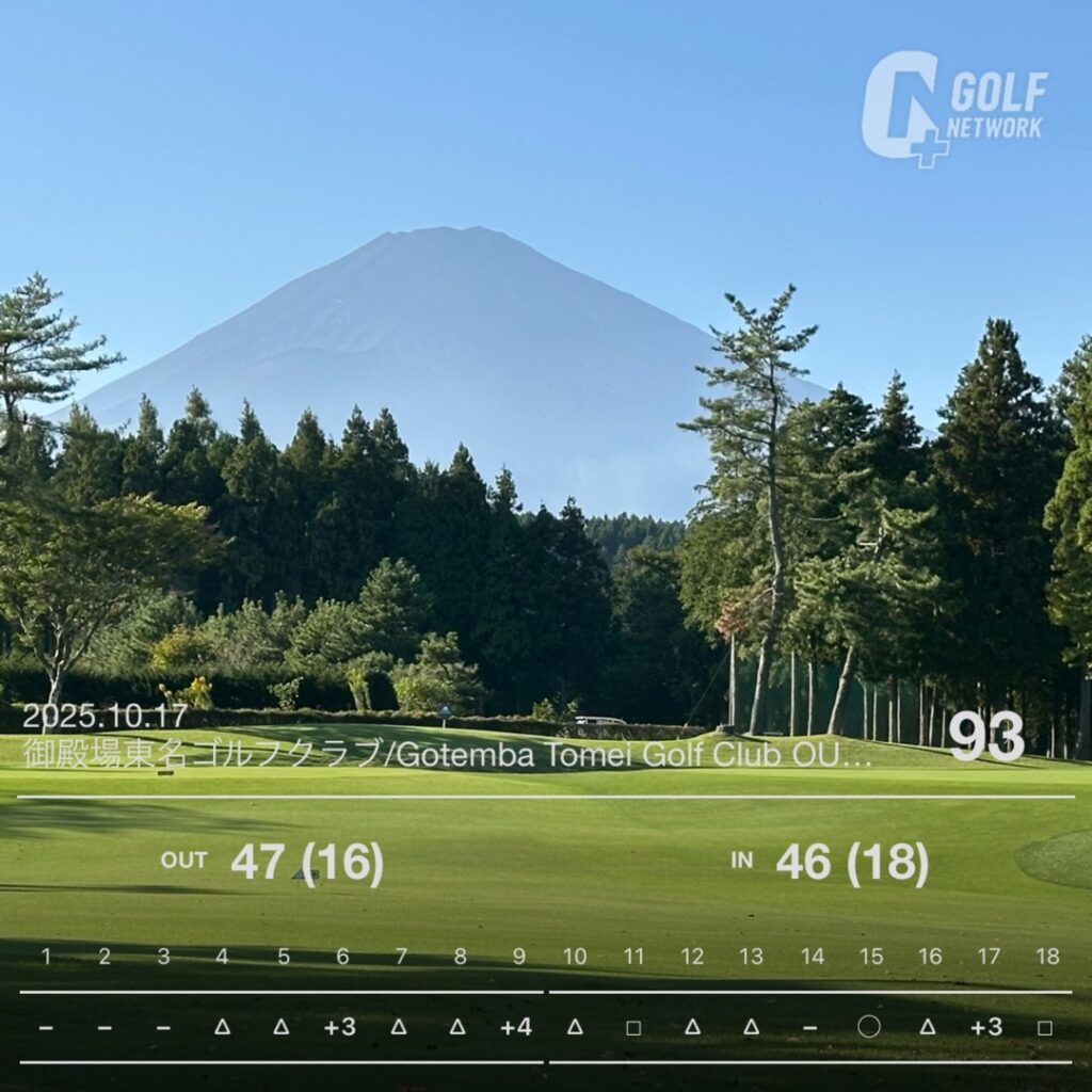 出だしはなんと3連続パーで、No4、No5はボギー。良い調子と思っていたらNo6でティーショットを右へOB。No9も左に引っ掛け林の中へ・・木と木と間から狙えそうだったので、7番アイアンで低く出したところ木に当たりOB。再度挑戦するもまたOB。ちょっとヤケクソになり3度目の正直も木に当たったが、なんとかOBにならず、6オン2パットのダブルパー。結果アウト47、イン46の93でした。左右が結構狭かったですが、距離が短かったのでなんとか90台で回れた感じでした。とても富士山も見えて、綺麗なコースでした。